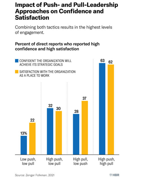 In fact, Joseph Folkman and Jack Zenger, founders of leadership development consultancy Zenger Folkman, have conducted research which suggests that a highly effective leadership style combines both an empowering ‘pull’ approach with an encouraging ‘push’.
