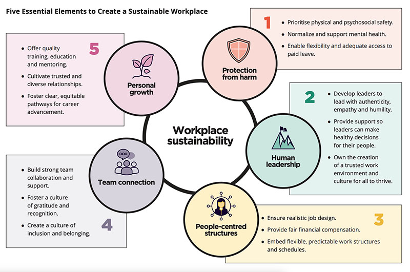 The five foundations of a sustainable workplace include personal growth through training and career development, protection from harm and strong connections among teams.