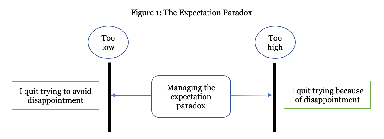 How do we manage this expectation paradox of lowering the bar to avoid disappointment and raising the bar to reach new heights (see figure 1), and drive the right behaviours to deliver desired results?