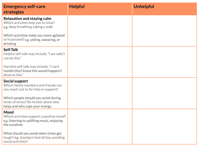 The second includes information about who makes up an individual’s support network, strategies for positive self-talk, activities that lift an individual’s mood or the trigger points for someone’s stress/anxiety.
