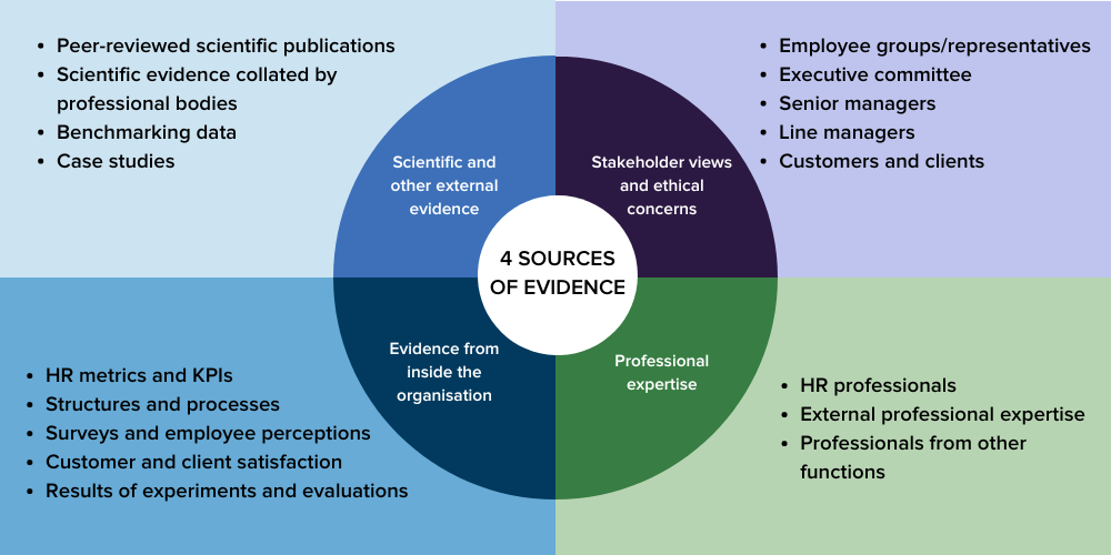 In a report published last year, the Corporate Research Forum broke down the sources of evidence typically drawn on by a well-rounded, evidence-based HR practice into a four-part framework, as shown below: